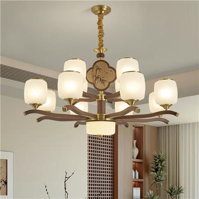 【QG-3042】黑胡桃木+H65铜材+印花玻璃灯罩 新款宋式美学黑胡桃木中古风客厅卧室吊灯