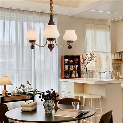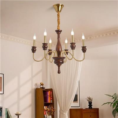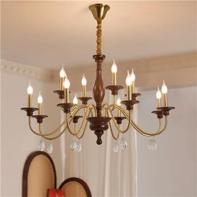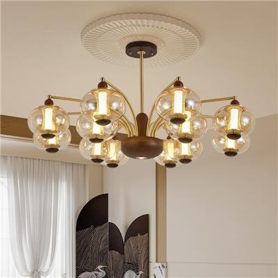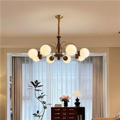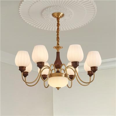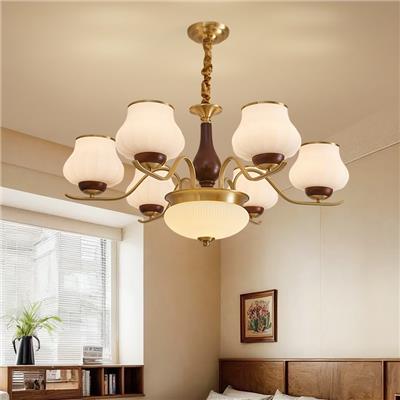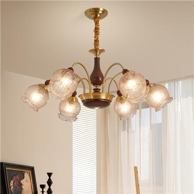 【D3002 】H65铜材+实木+玻璃灯罩 爆款全铜实木中古风胡桃木色复古客厅卧室吊灯